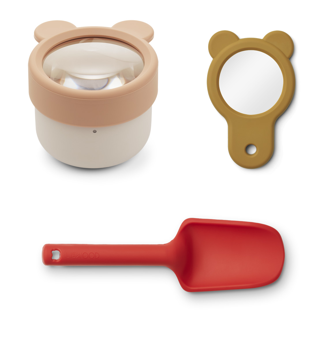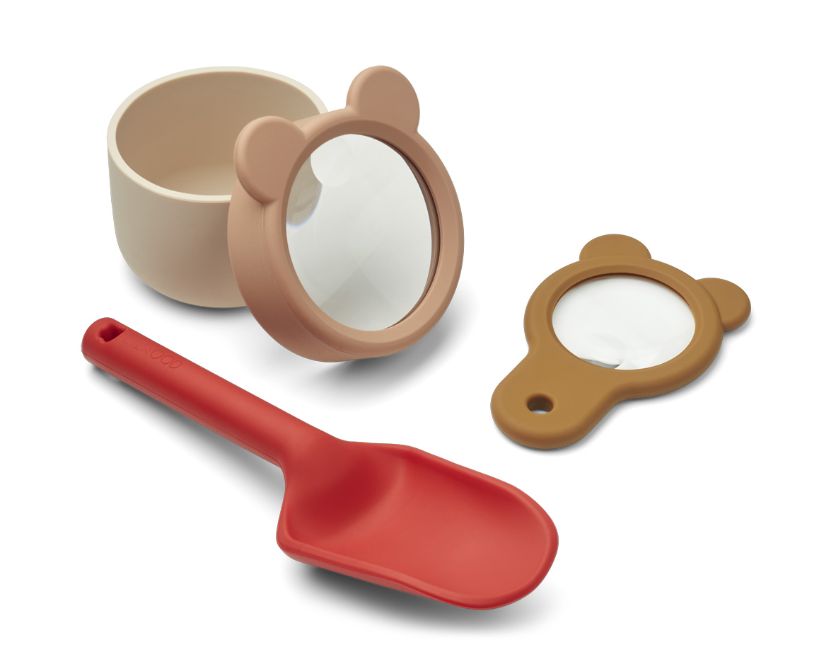 Das Silikon-Entdecker-Set BESSIE von LIEWOOD ist ein Muss für alle kleinen Entdecker und Naturräuber. Ausgestattet mit Schaufel, Eimer und Lupe lässt sich die Natur stundenlang erkunden. Egal ob Käfer, Raupen oder anderen Insekten – mit der Lupe kannst du genau schauen, was du im Wasser, im Wald oder auf der Wiese gefunden hast. Die Schaufel und den Eimer kannst du zum Ausbuddeln und Transportieren benutzen.