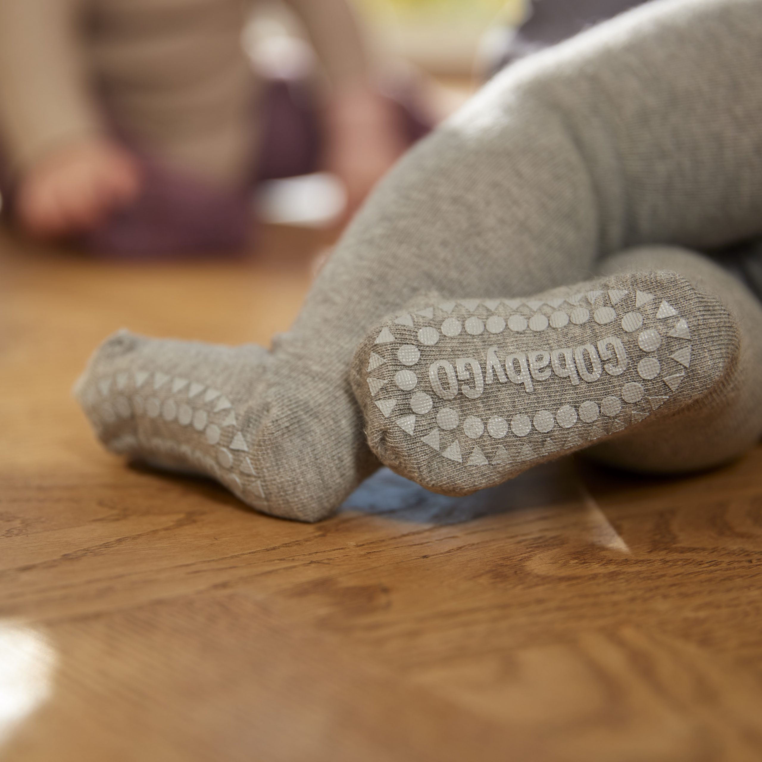 GoBabyGo entwirft rutschfeste Socken für aktive Kinder. Mit speziell entwickelten Gumminoppen an den Knien, unter den Füßen und auf den Zehen werden die motorischen Fähigkeiten und das Gleichgewicht des Kindes beim Krabbeln und Gehen gestärkt. Die Gumminoppen helfen dabei, dass das Kind nicht auf glatten Böden rutscht. Es ist dadurch beweglicher und mutiger.